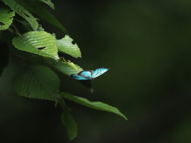 オス発生期には比較的高頻度で樹間の占有飛翔に出会う事があり眼下の枝先に静止し良く開翅する、また卍飛翔も長く続くことが多いので飛翔時でも比較的撮影しやすい。メスは飛び方は比較的緩慢で発生地の樹間やその下草等で見られた。